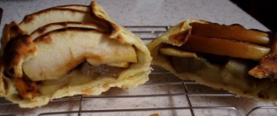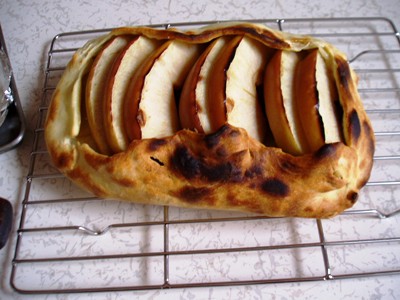 材料:リンゴ1個。ほか全て目分量!!粉をてきとーに練っただけ。パイっつーかピザ生地に近いです。上に乗っかってるの以外にも、中にぎっしりリンゴの煮たのが詰まってます。