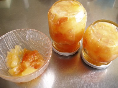 リンゴ1個半でこれだけできました。瓶を逆さにしてるのは、煮沸した瓶はこうして冷ますとと保存が効くらしい。オレンジ色してるのは皮も一緒に煮込んだからです。