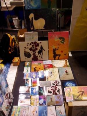 だが場所は壁際のはじーっこ。正直、暗い。人来にくい。でもすぐそばの非常口の所でライブやってて、ジャズ生演奏聞き放題だったのは良かったです。